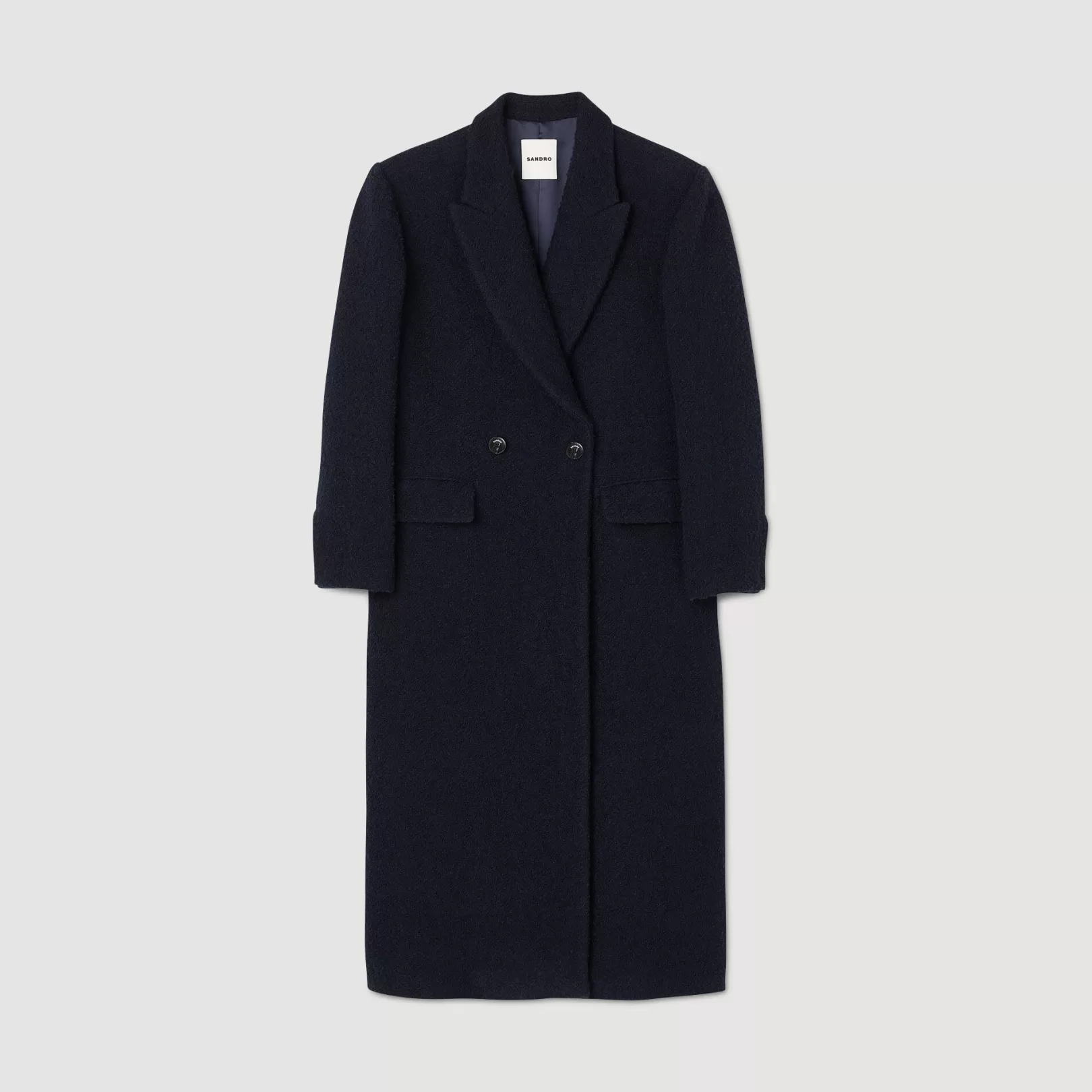 Long coat in wool bouclé fabric, featuring a lapel collar, long sleeves, a double-breasted design and flap pockets.