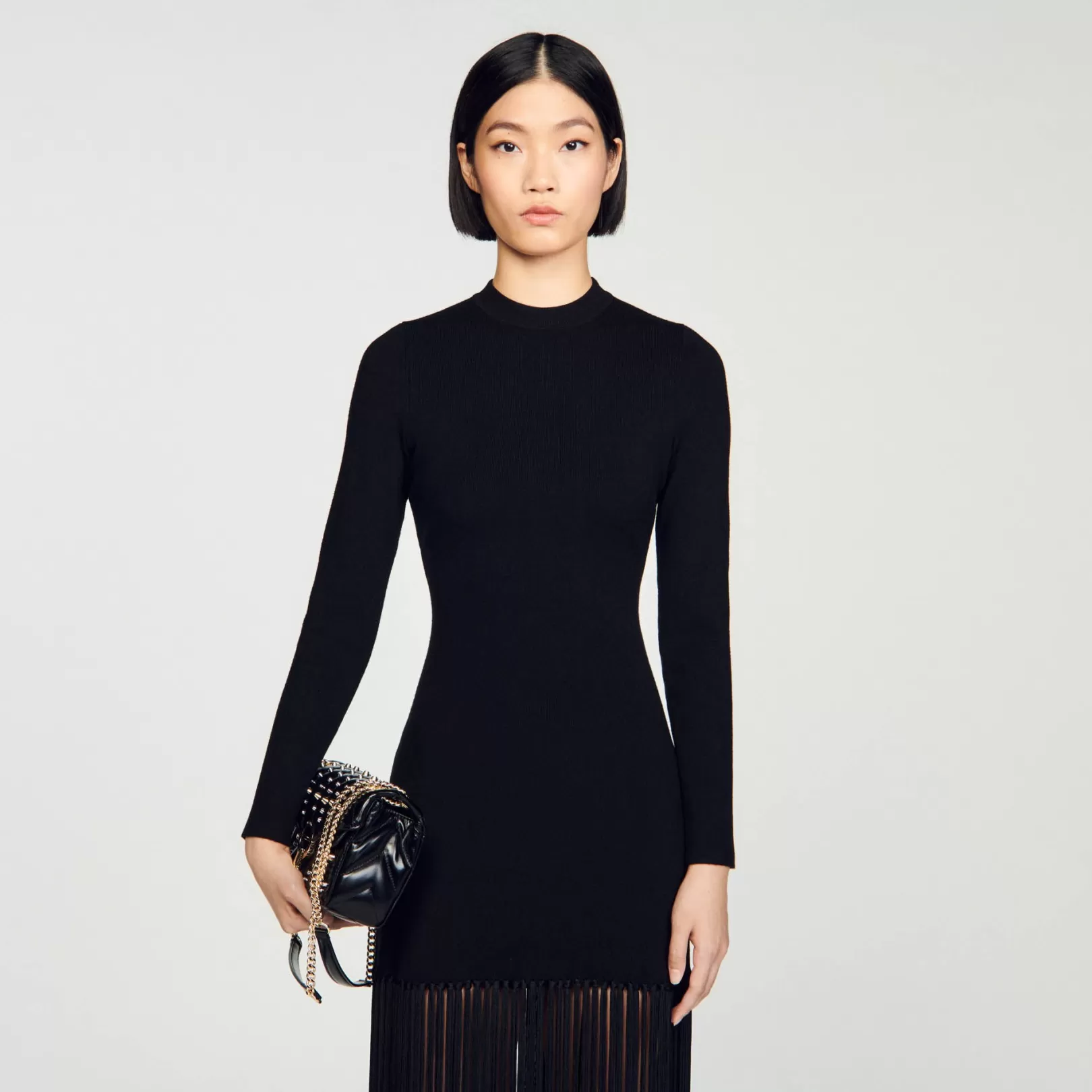 DescriptionKnitted maxi dress with round neck and long sleeves, embellished with fringes at the bottom. Sandro Women’s knit maxi dress Figure-hugging Round neck Long sleeves Fringed hem The model is…