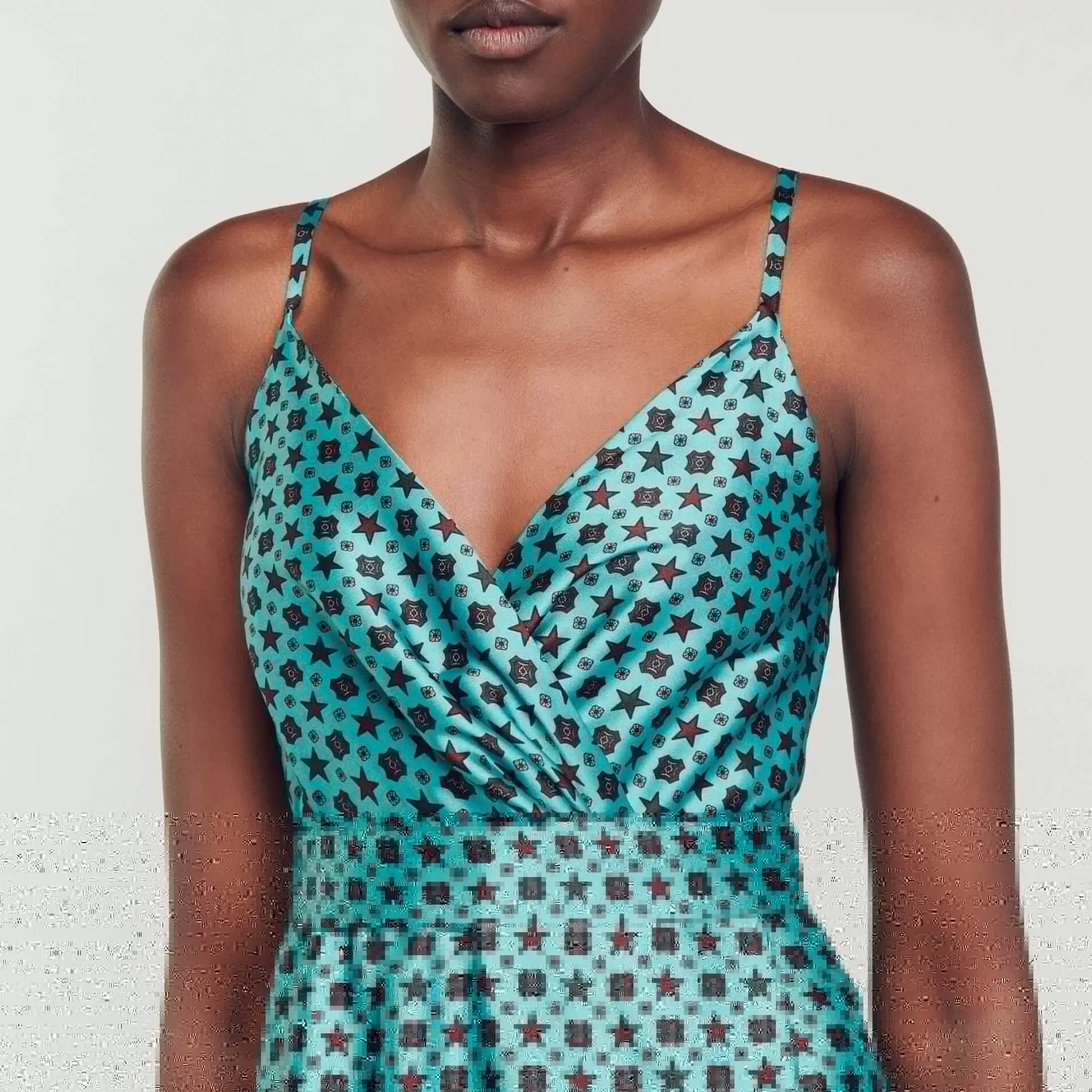 Strappy midi dress with a crsover V-neckline, straps, a ruffle on the lower skirt, and a Stellar Festival print.