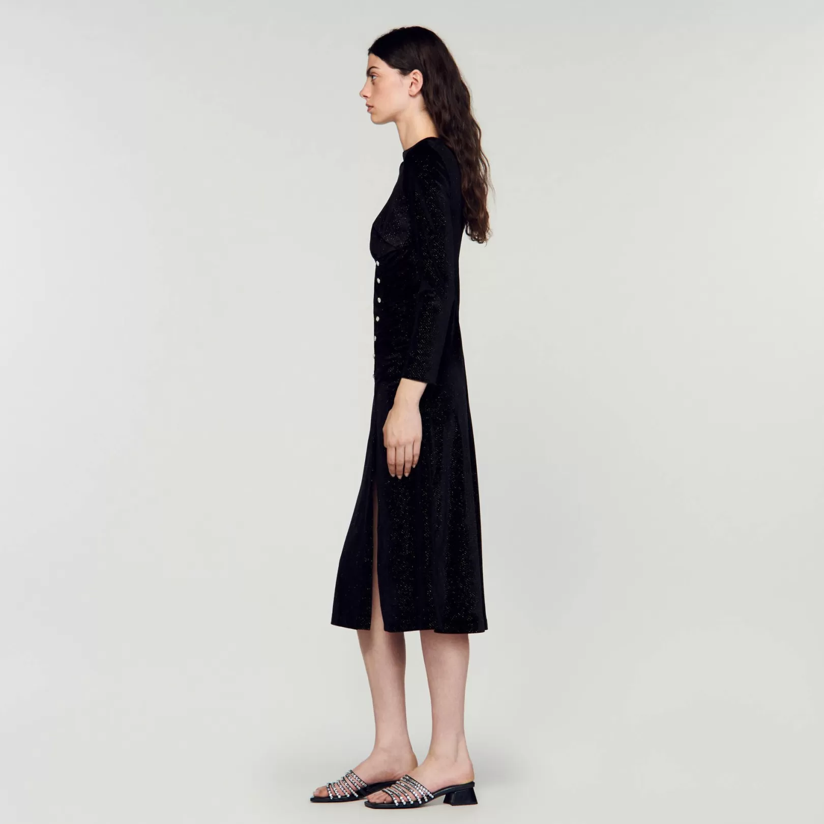Sequinned velvet midi dress with draped effect, featuring a round neck with a slit, long sleeves, a side slit and embellished with jewellery buttons on the side.