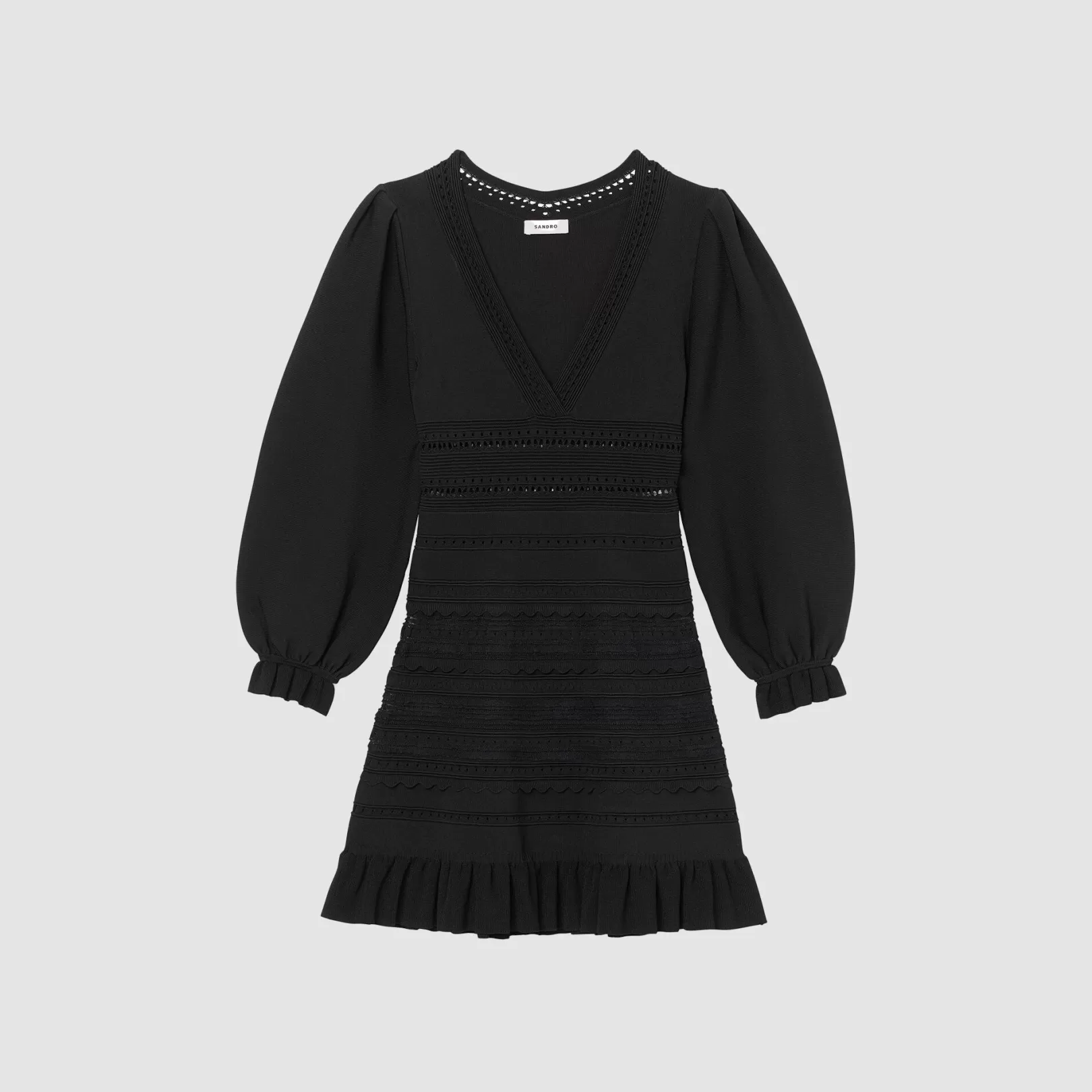 DescriptionShort pointelle knit dress featuring a V-shaped neckline, long sleeves, voluminous shoulders, ruffled cuffs, and a ruffle skirt with scalloped details. Sandro Women’s short pointelle knit dress V-shaped neckline with…