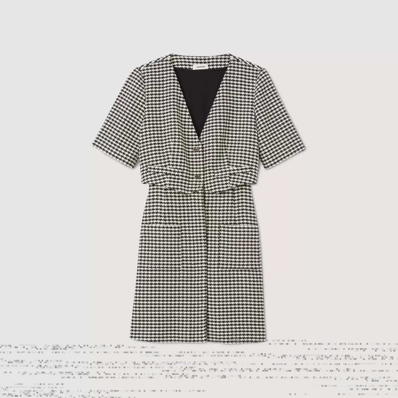 Short houndstooth tweed 2-in-1 dress featuring a layered top with a crsover V-shaped neckline and buttons, short sleeves, and a straight-cut skirt.