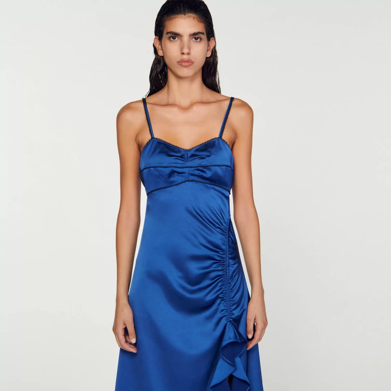 DescriptionFloaty, satin-effect dress with lingerie-style spaghetti straps, featuring a corset-style neckline, hook-and-eye fastenings at the back, and an asymmetrical skirt gathered and ruffled at the front with drawstrings. Sandro Women’s…
