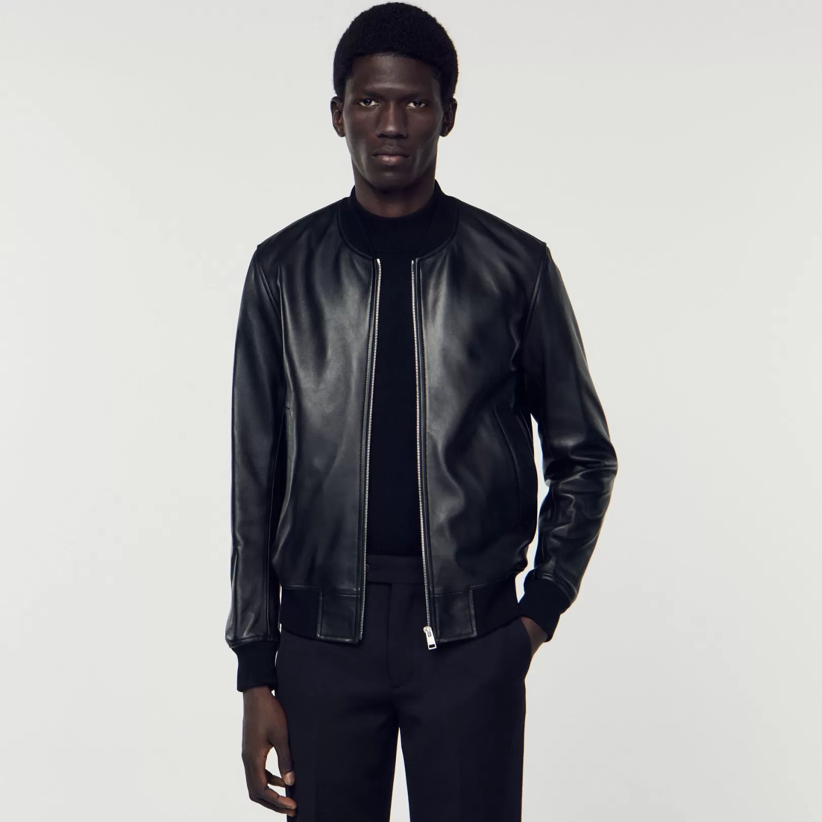 Smooth leather varsity jacket with a ribbed collar, cuffs and waist, long sleeves, zip fastening and two side pockets.