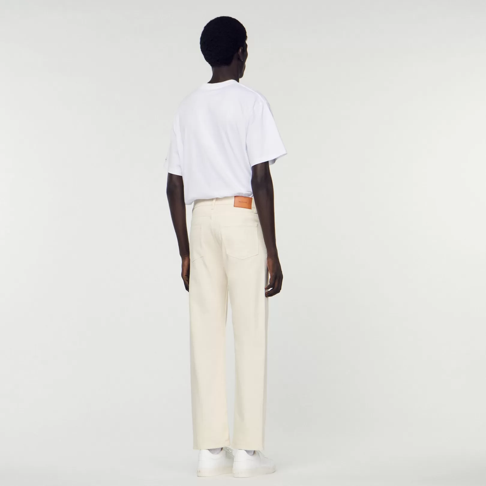 Straight-leg cotton jeans with 5 pockets and an embsed Sandro leather jacron label at the back.