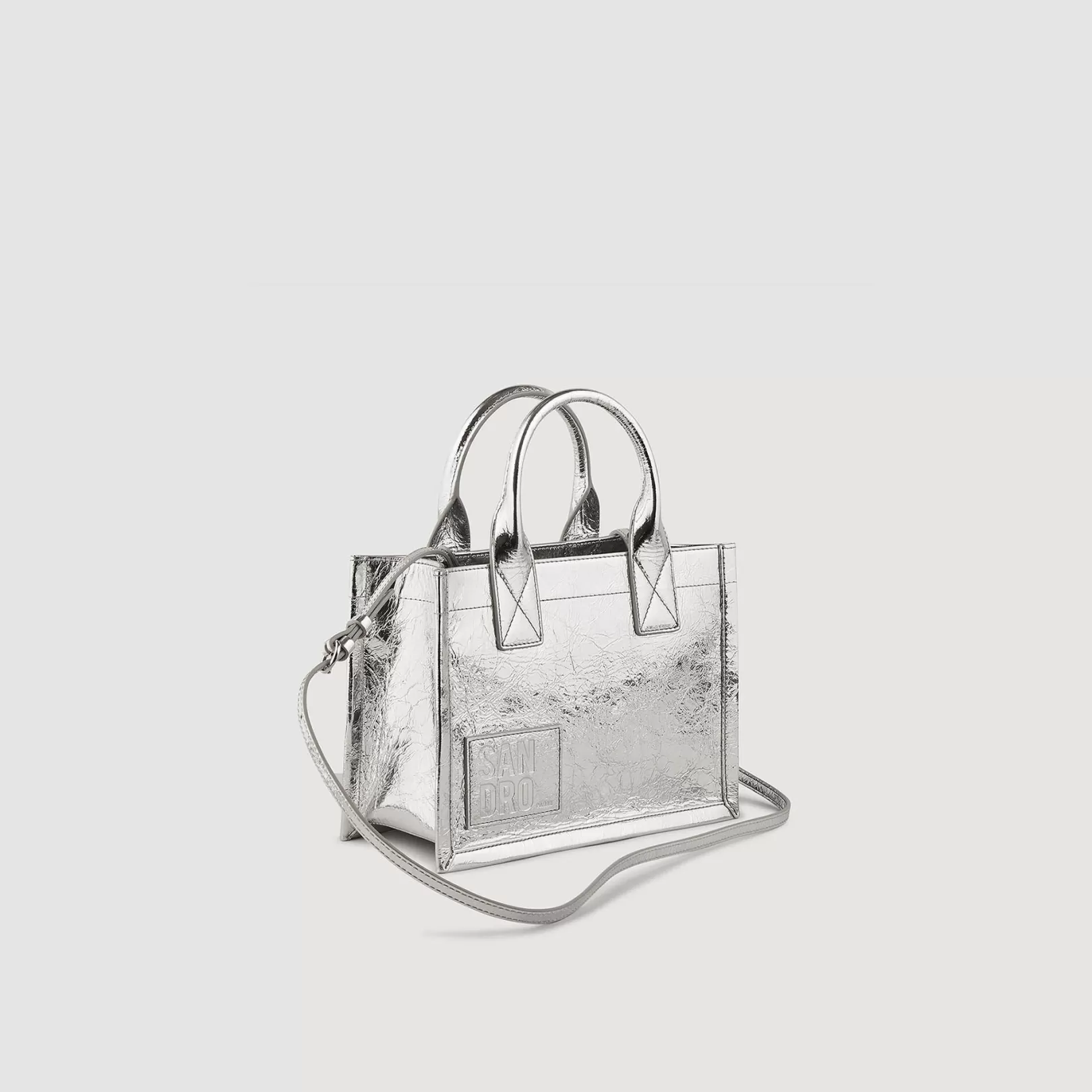 Small metallic leather tote bag with a crinkle effect, tone-on-tone embsed Sandro label, magnetic fastening, small handles and an inside pocket.
