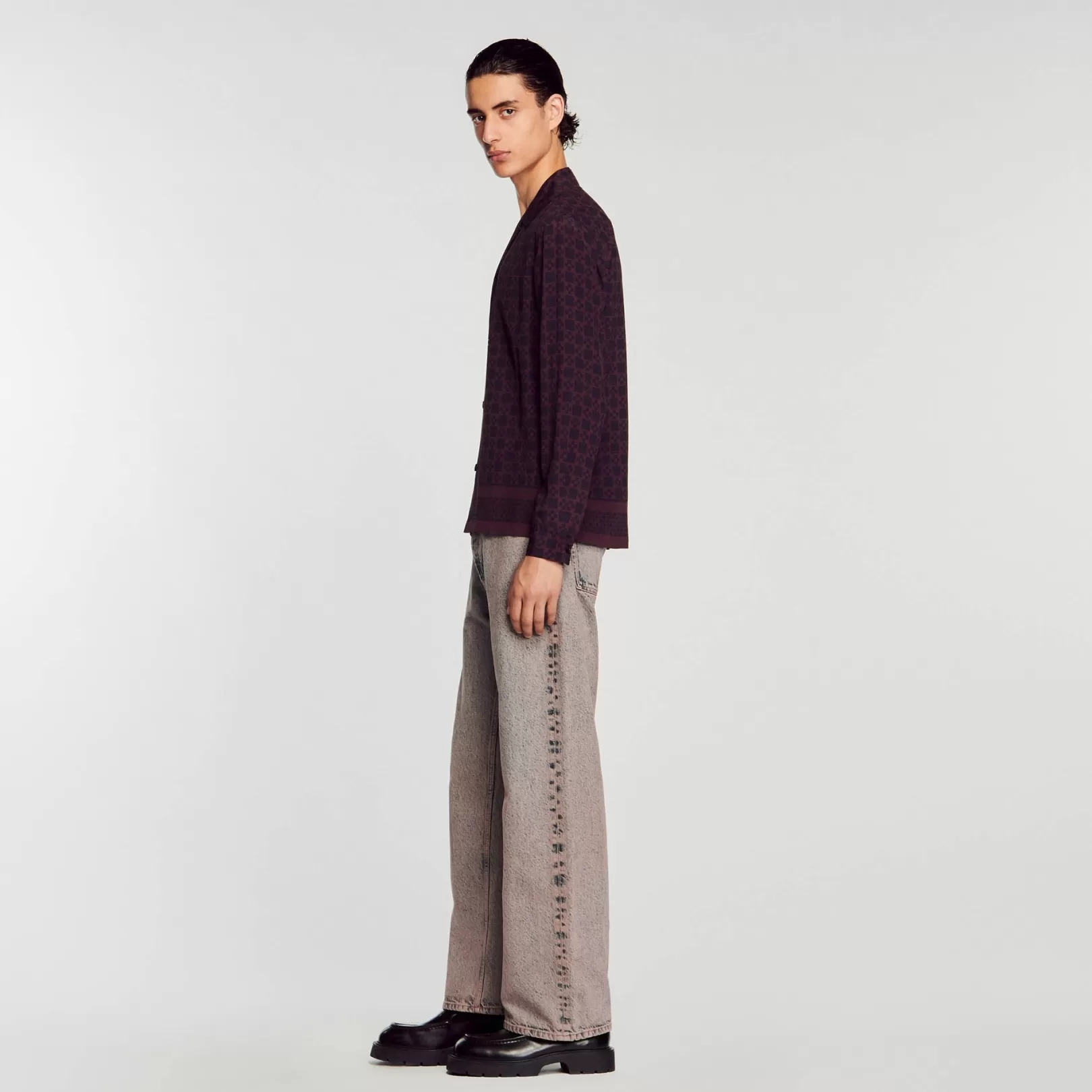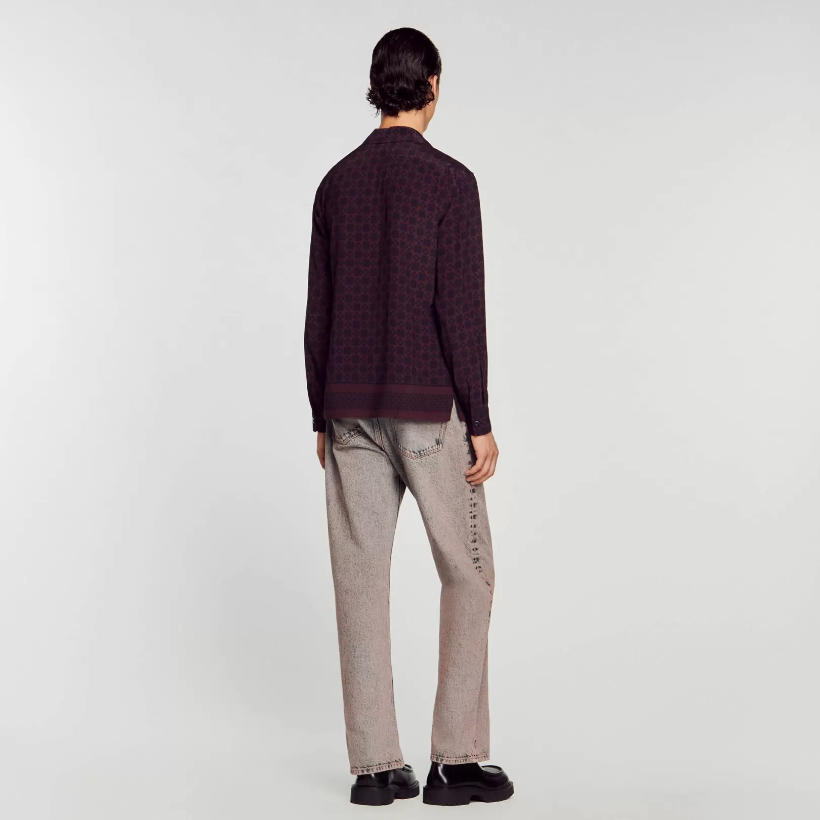 Flowing button-down shirt with long sleeves, a shark collar, a Square Crs print, and a contrasting stripe on the bottom.