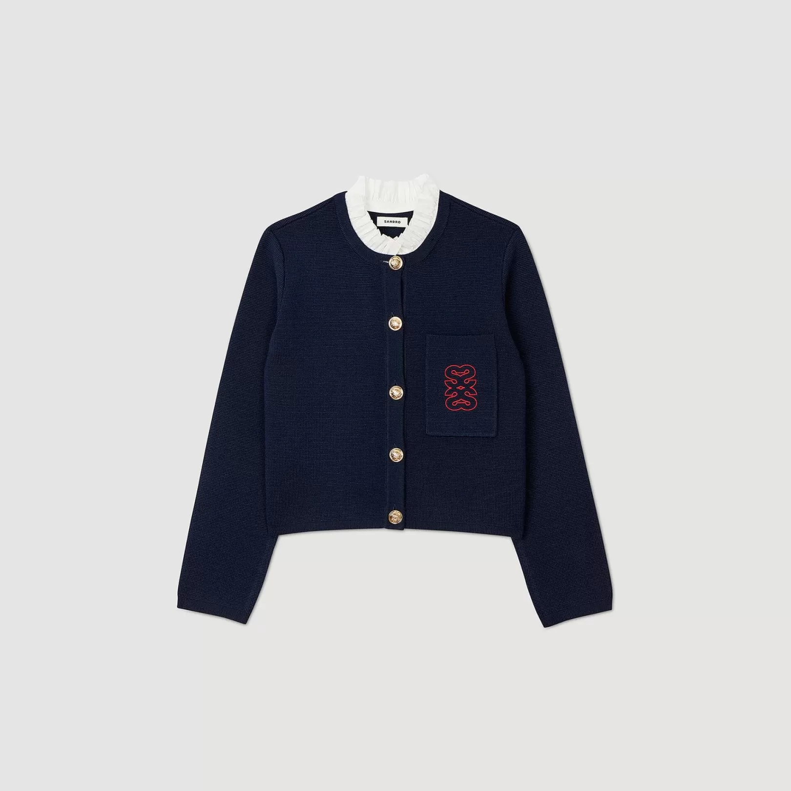 Fancy knit coatigan with ruffled poplin stand-up collar, long sleeves, chest pocket with contrasting embroidery and gold decorative button fastening.