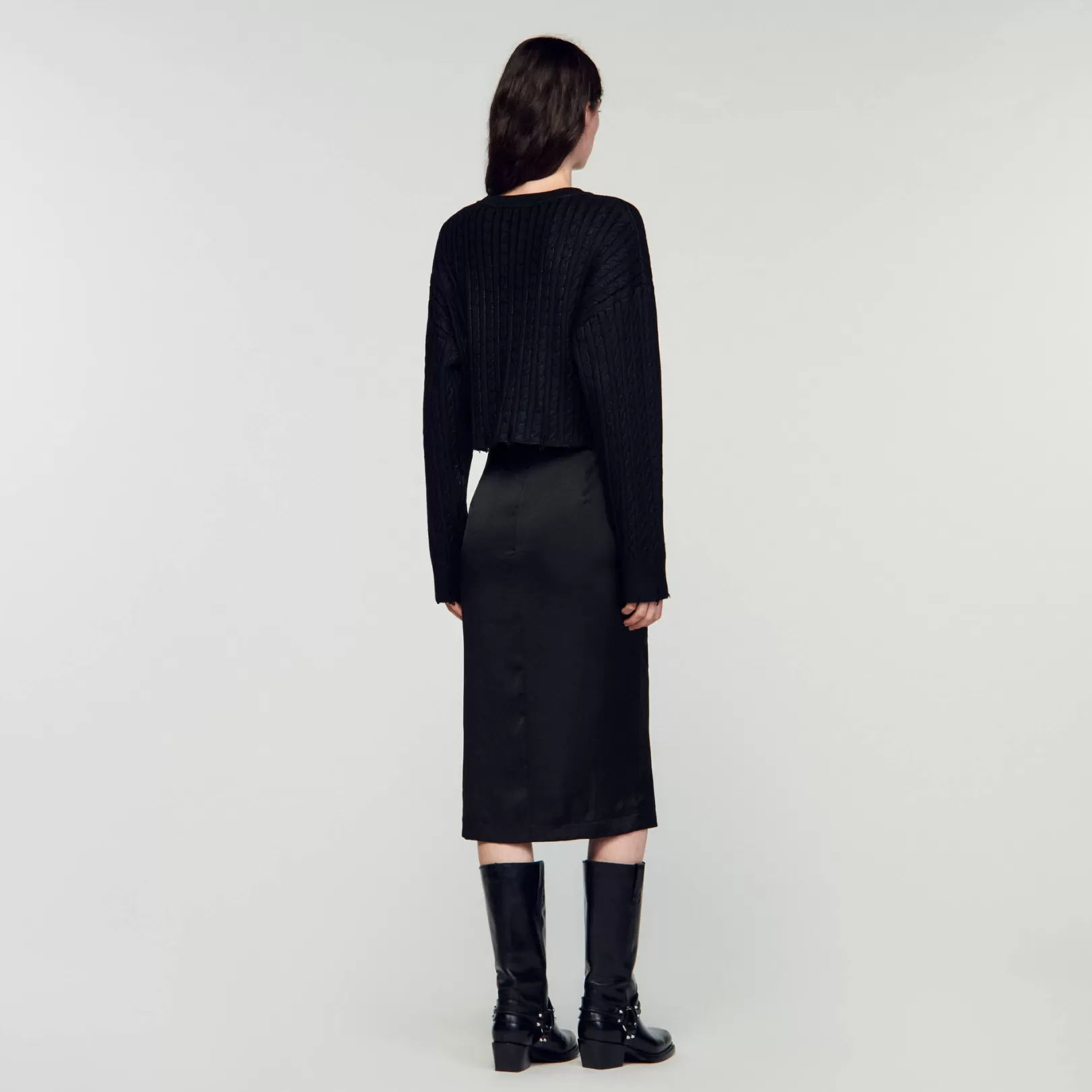 Cropped sweater in shiny cable knit with round neck and long sleeves, embellished with frayed edges at the bottom.