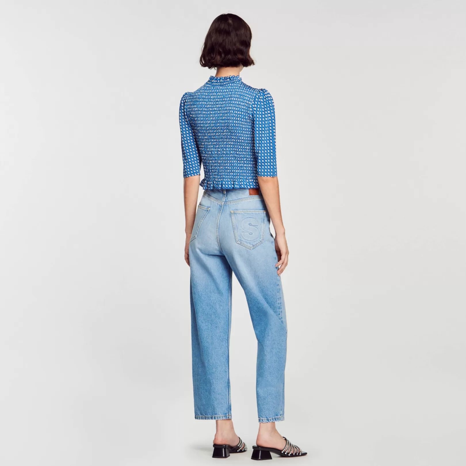 Smocked top with a high ruffled collar, 3/4-length sleeves, and a tie print.